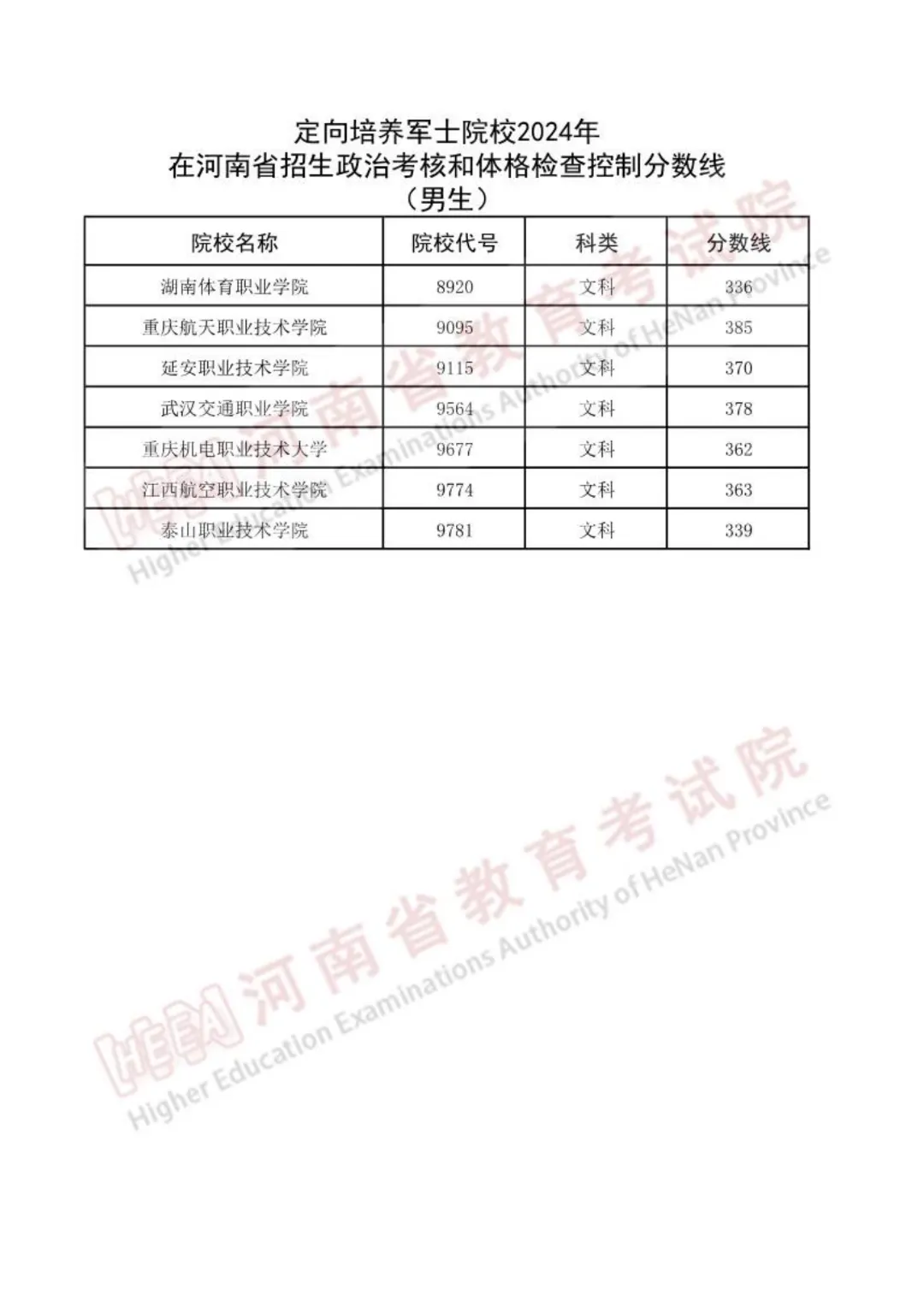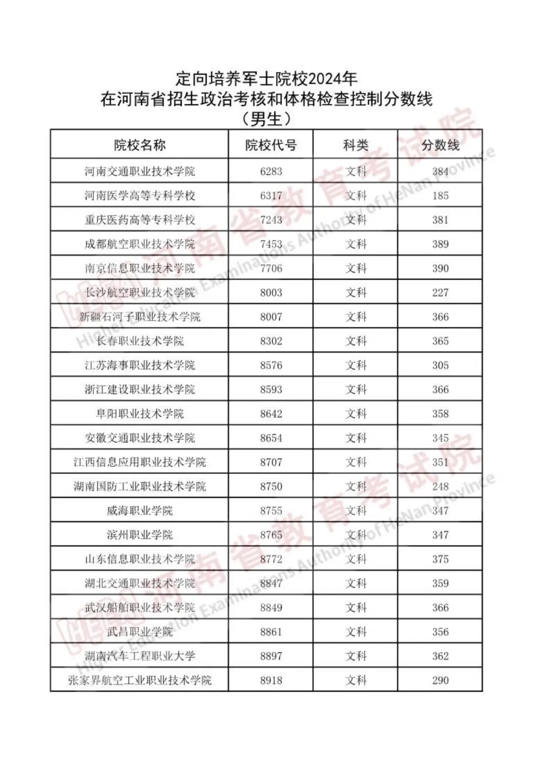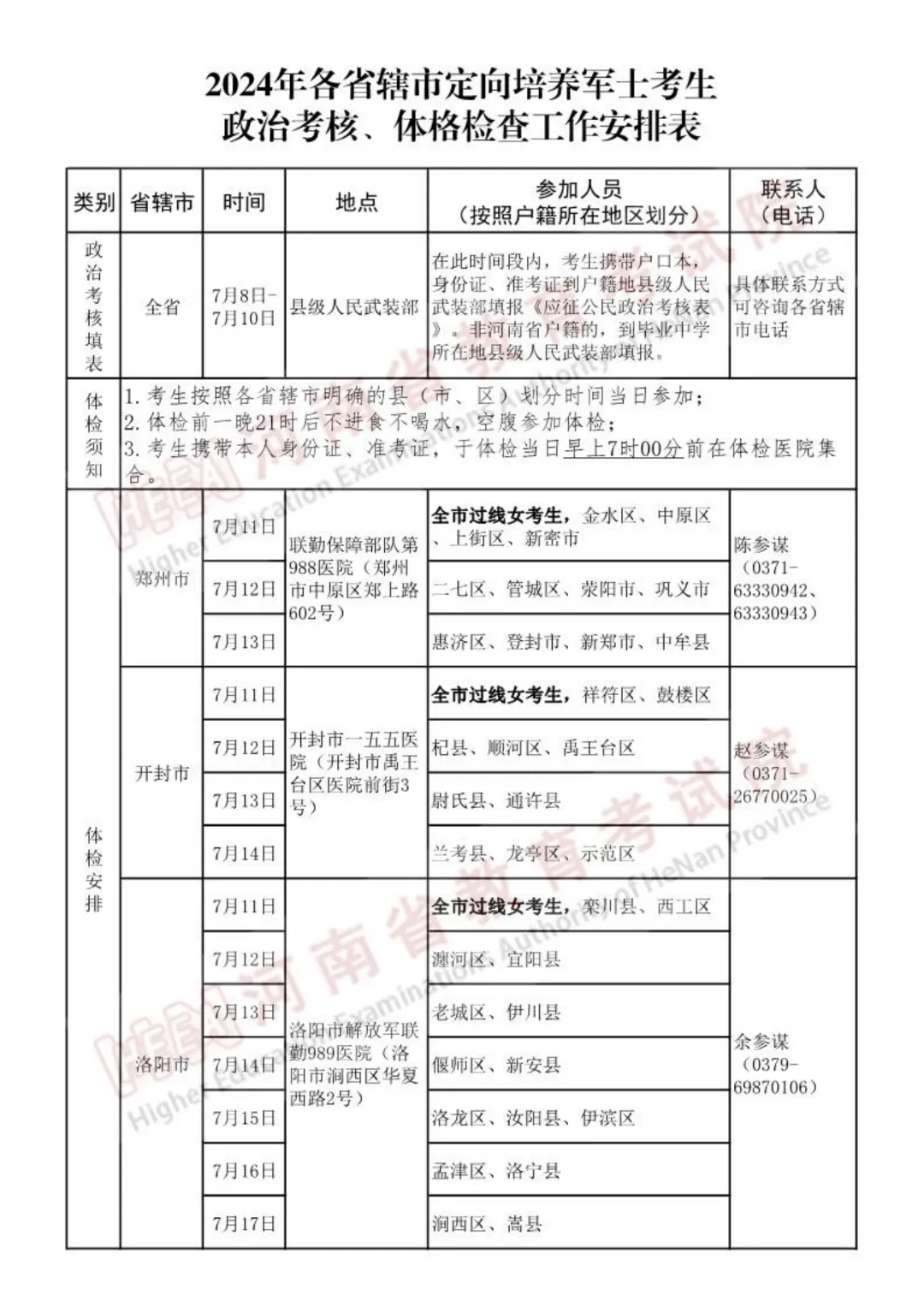 根据河南省教育厅、公安厅和省军区动员局《关于做好2024年招收定向培养军士工作的通知》(豫军动〔2024〕19号)文件要求,现将河南省2024年普通高校招生定向培养军士政治考核和体格检查控制分数线、时间、地点等相关要求予以公布,请达到院校(仅限第一志愿)控制分数线的考生,在规定时间携带相关资料到指定地点参加政治考核和体格检查。