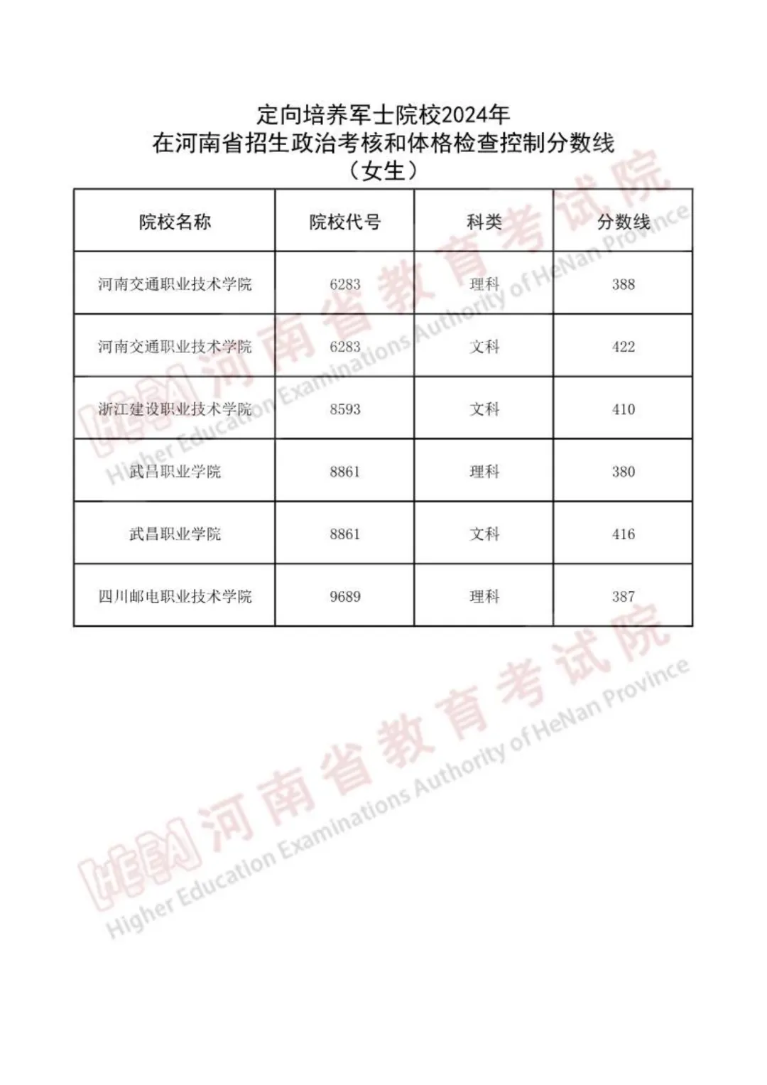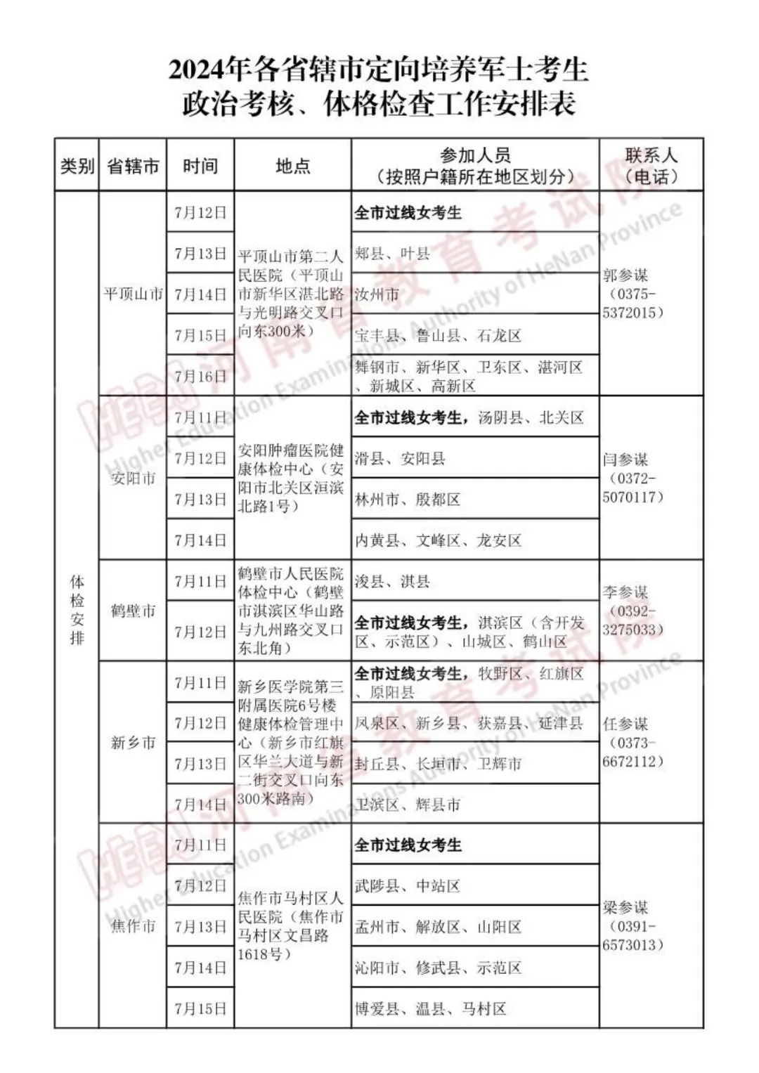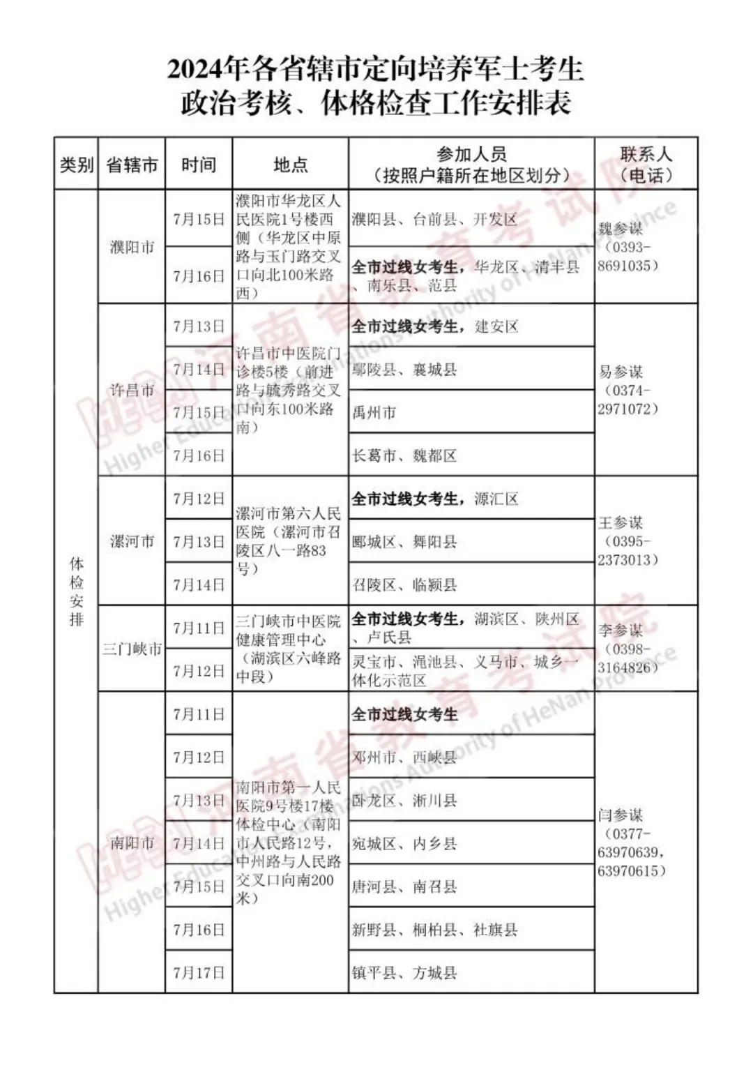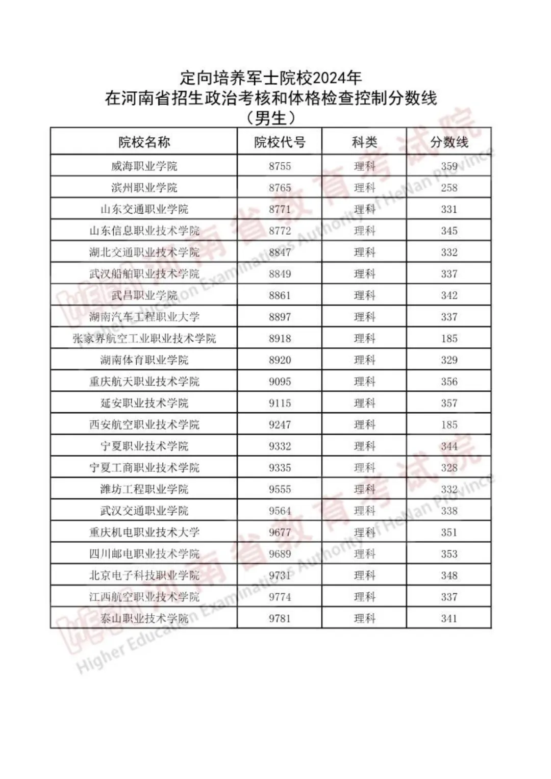 根据河南省教育厅、公安厅和省军区动员局《关于做好2024年招收定向培养军士工作的通知》(豫军动〔2024〕19号)文件要求,现将河南省2024年普通高校招生定向培养军士政治考核和体格检查控制分数线、时间、地点等相关要求予以公布,请达到院校(仅限第一志愿)控制分数线的考生,在规定时间携带相关资料到指定地点参加政治考核和体格检查。