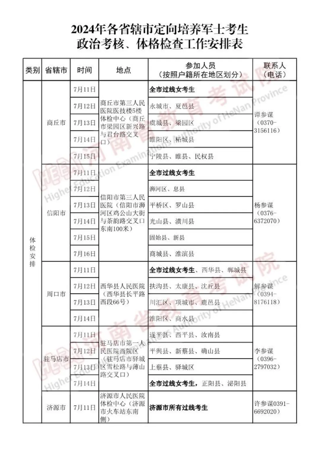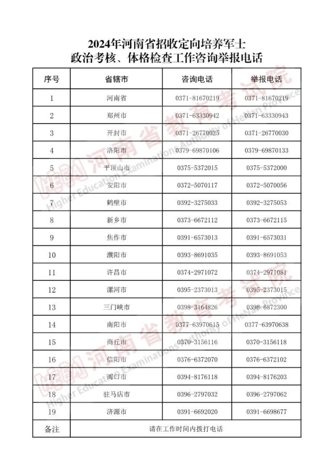 2.2024年各省辖市定向培养军士考生政治考核、体格检查工作安排表及咨询举报电话