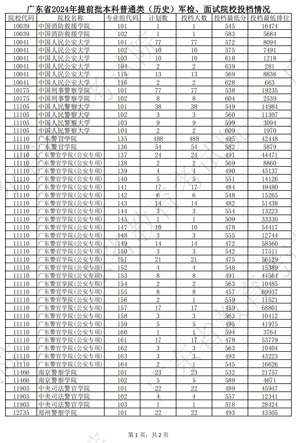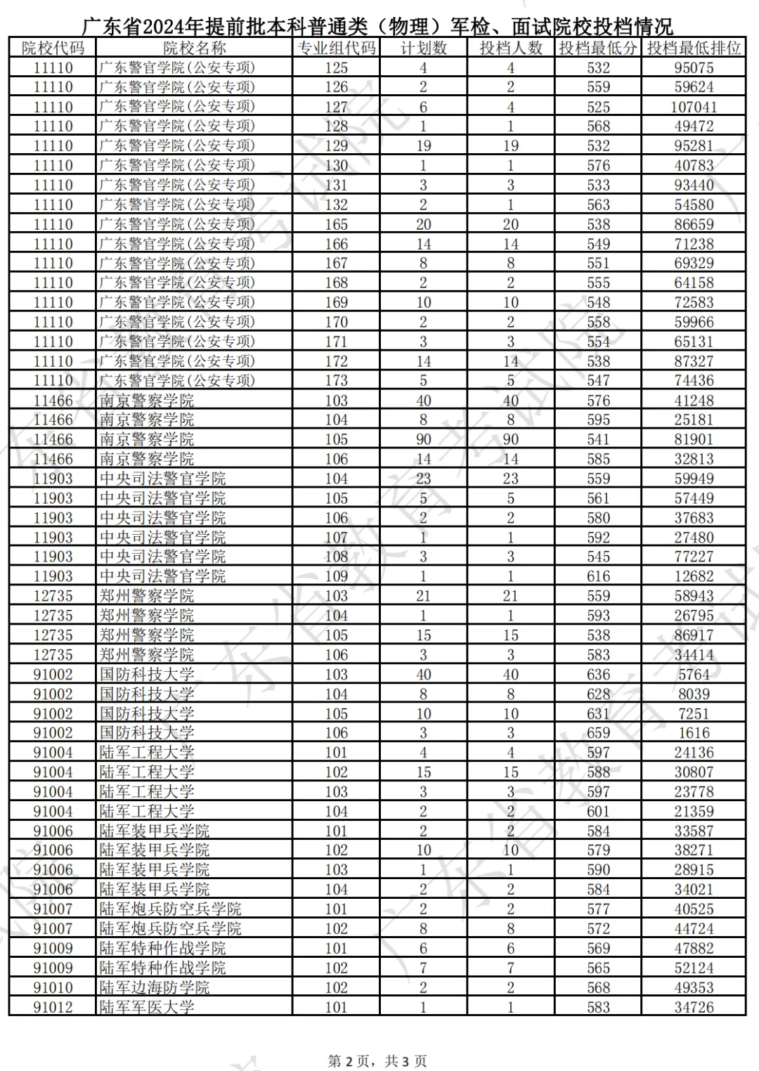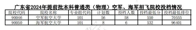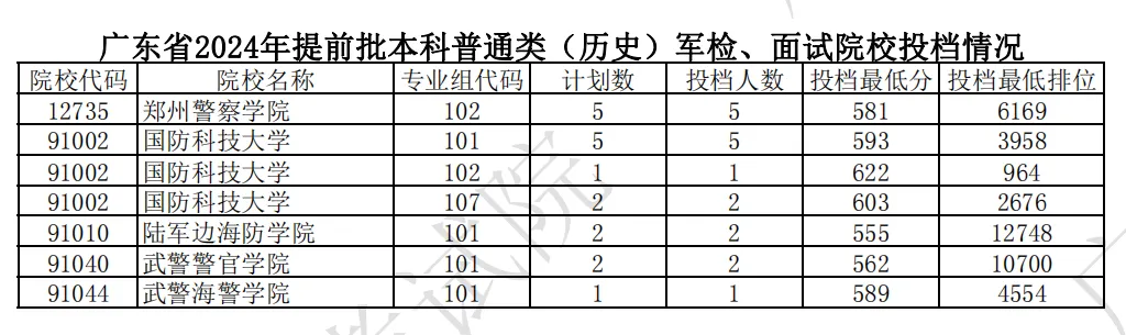 温馨提示:模拟志愿填报用掌上高考,信息丰富准确,一键生成“冲-稳-保”志愿。点击此处,开始精准填报吧!广东省2024年夏季普通高校招生录取工作于7月8日正式开始。省招生办对提前批普通类的空军、海军招飞和军检院校以及本科艺术类院校的“统考+校考”类别和戏曲类省际联考进行了投档。目前,空军、海军招飞已完成录取工作,其中空军招飞录取60人,海军招飞录取6人。军检院校共投出3211人,其中军检院校普通类(物理)投出2121人,普通类(历史)投出1090人。从投档结果来看,绝大部分院校均满档。提前批军检院校以及本科
