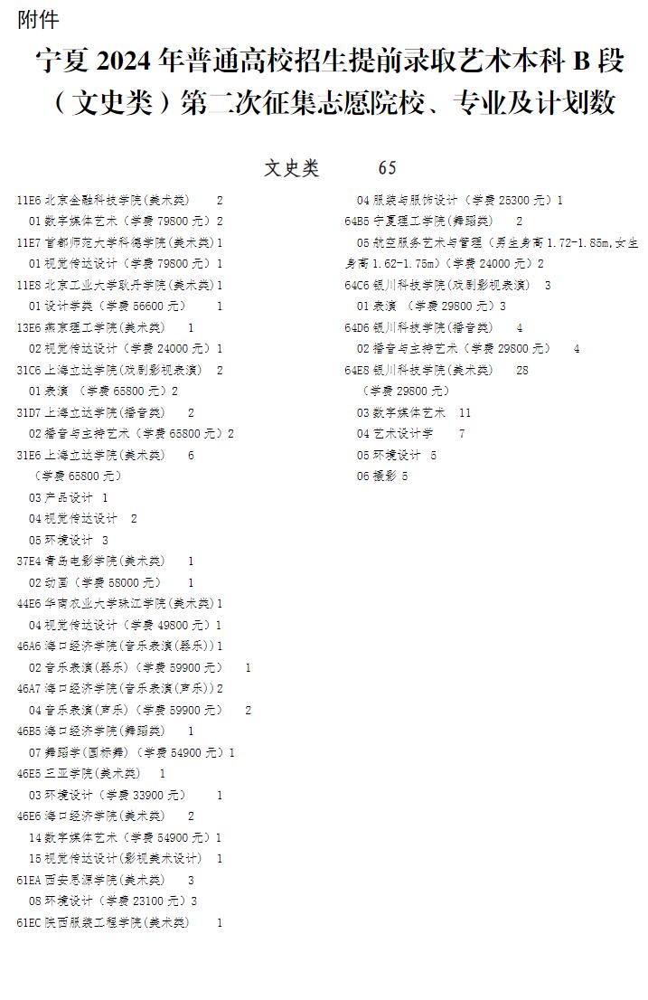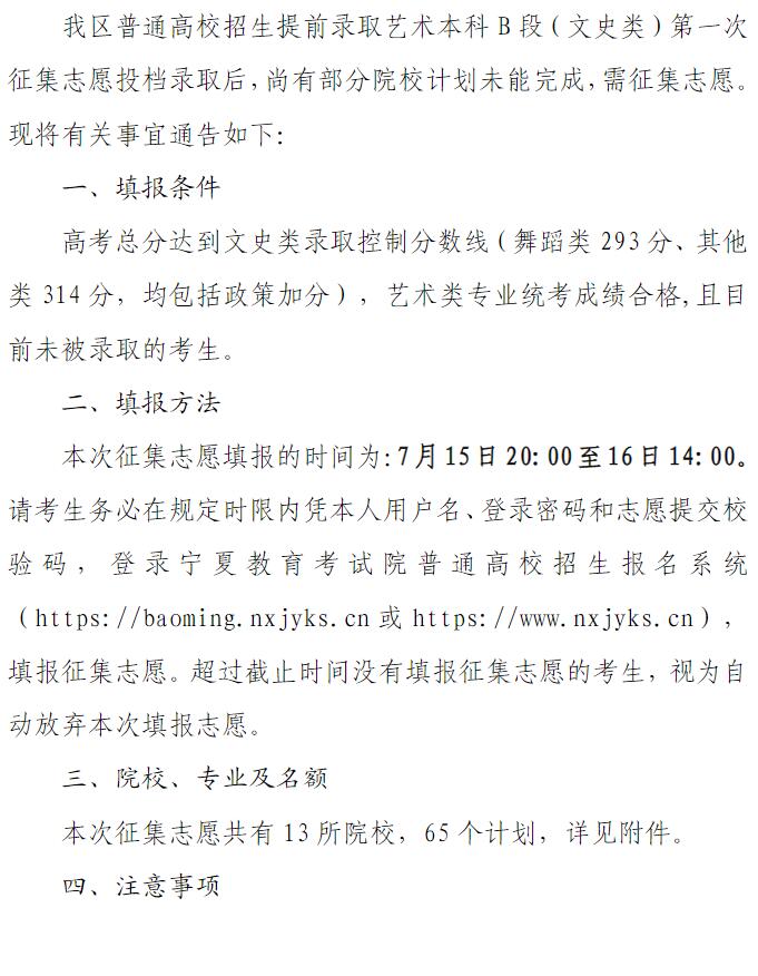 宁夏:2024年高考提前录取艺术本科B段(文史类)第二次征集志愿通告