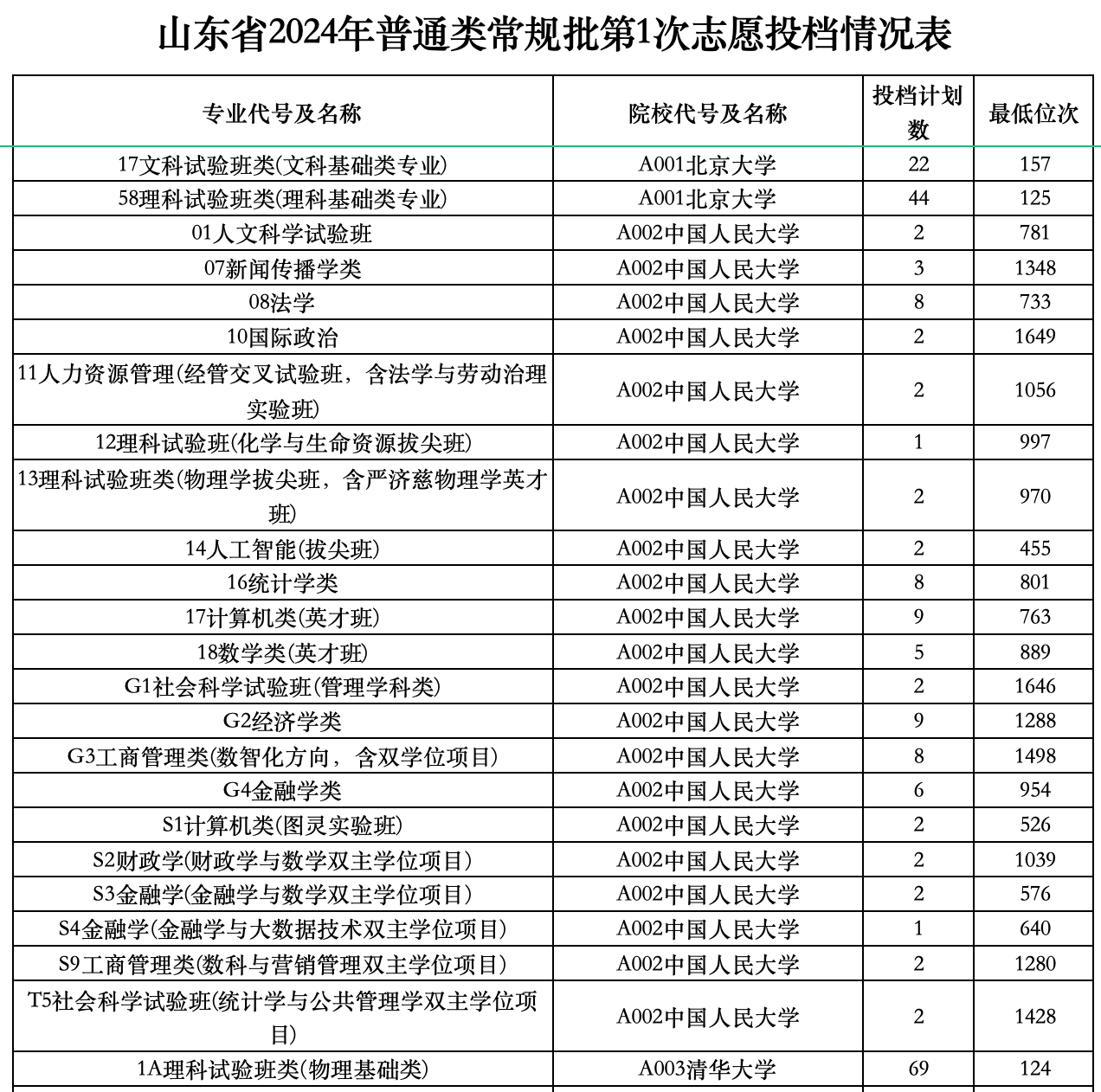 2024年山东高考普通类常规批第一次(本科)投档表公布