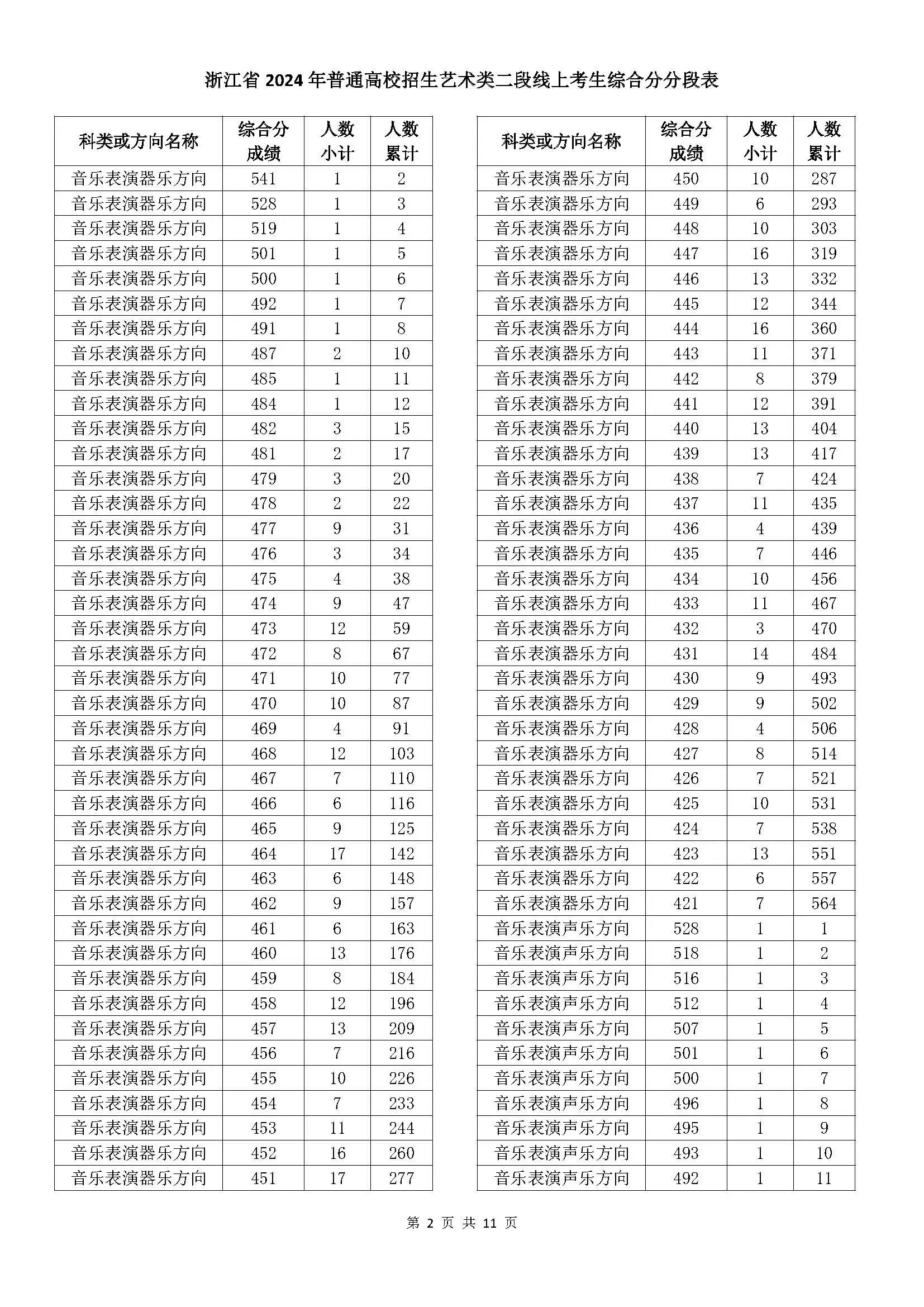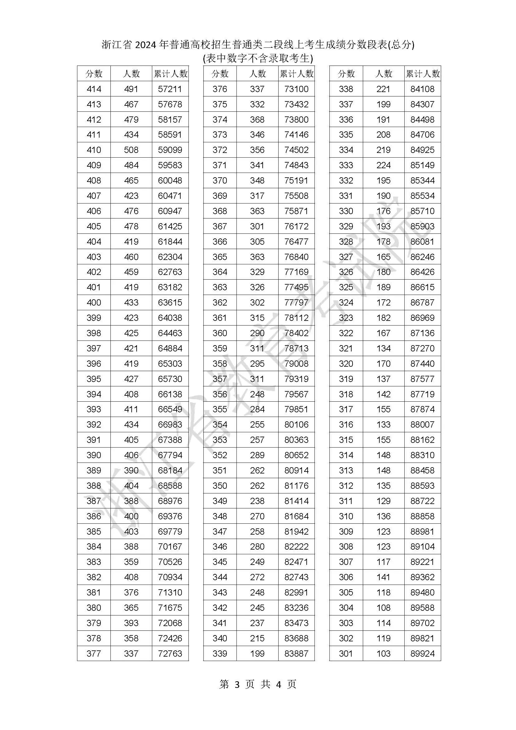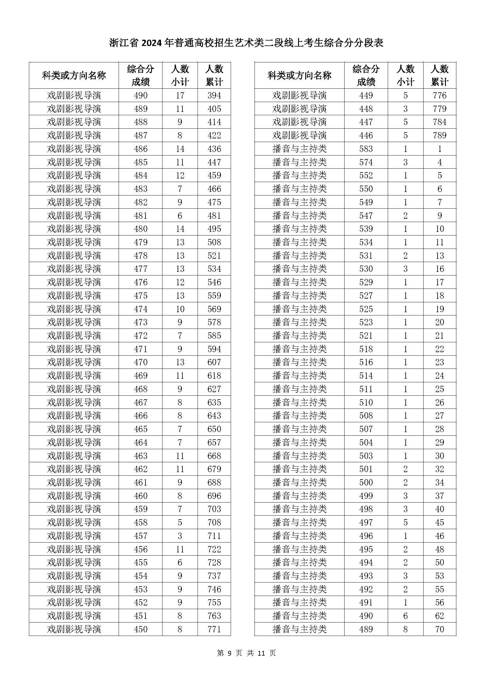 二段线上考生成绩分数段表(总分)浙江省2024年普通高校招生艺术类