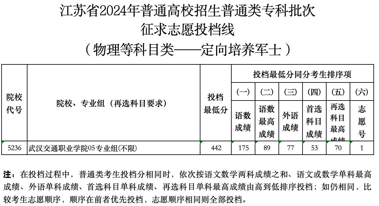 温馨提示:模拟志愿填报用掌上高考,信息丰富准确,一键生成“冲-稳-保”志愿。点击此处,开始精准填报吧!江苏省2024年普通高校招生普通类专科批次征求志愿投档线(定向培养军士)