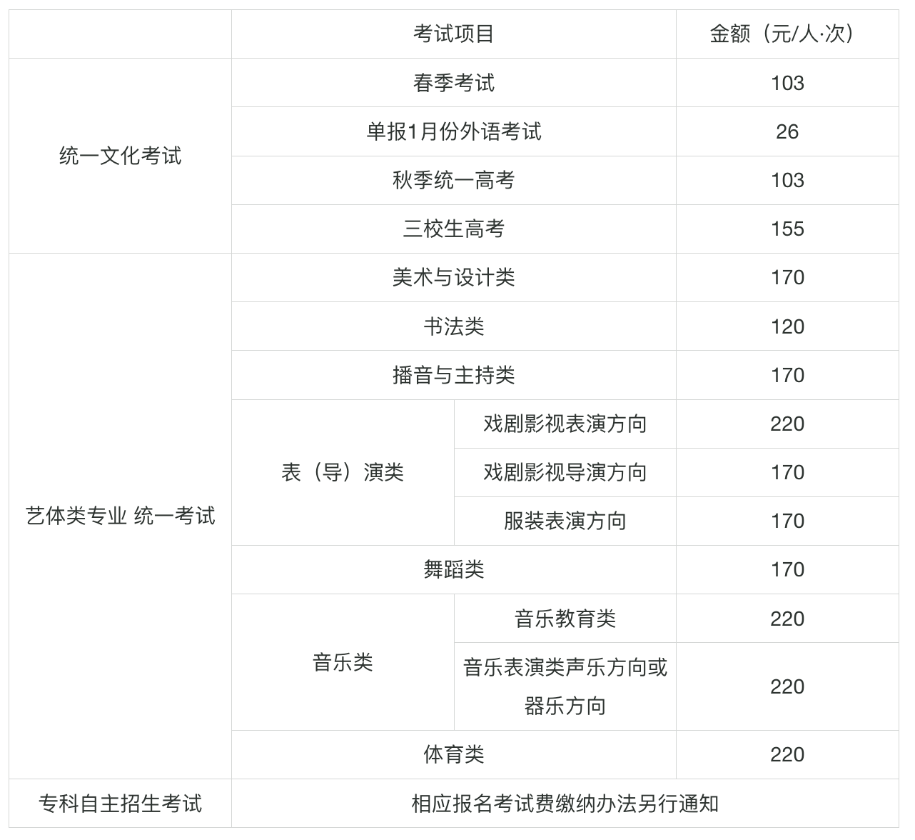 根据《关于上海市教育考试院有关考试收费等问题的复函》(沪价费〔2006〕005号)、《关于调整上海市教育考试院外语口语考试等收费标准的复函》(沪价费〔2003〕069号)文件规定,文化考试收费标准:报名费为每项考试25元/人,考试费为每项考试每科目26元/人;艺体类考试收费标准:报名费为每项考试20元/人,考试费为每项考试每科目50元/人。各类考试项目须缴纳费用如下表所示: