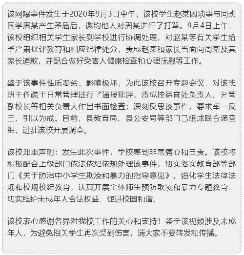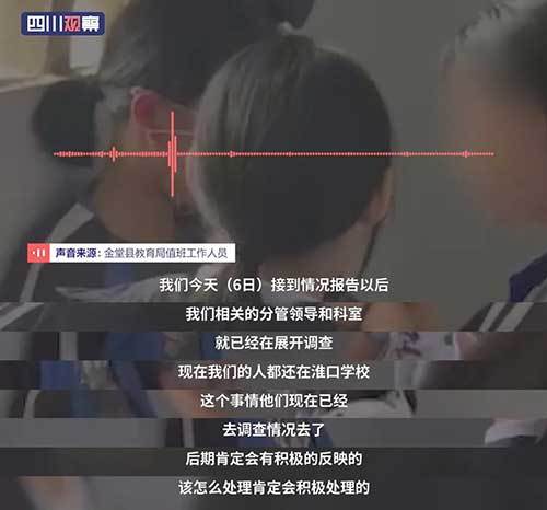 记者随后致电金堂县教育局,值班工作人员称教育局已关注到此事,并迅速启动调查,9月6日下午,县教育局的工作组仍在学校进行调查取证,将根据调查结果进行处理。