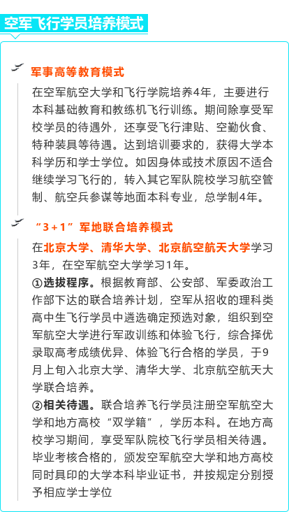 空军飞行人员是国家的特殊人才和宝贵资源,其招收培养属国家行为。招收飞行学员(简称招飞)工作,在国家教育部、公安部、财政部和军委政治工作部领导下,由空军会同有关省(自治区、直辖市)的教育、公安部门组织实施,纳入全国普通高校招生体系,是军队院校招生工作的重要组成部分。空军设立招飞局,辖沈阳、北京、兰州、济南、南京、广州、成都7个选拔中心,济南选拔中心主要负责山东、河南两省的招飞工作。1987年空军自主招飞以来,承担了空军和陆航部队全部招飞任务,除为国家培养选拔航天员外,还为海军航空兵输送了大批飞行骨干人才,累计招收飞行学员4万余名,较好地满足了国防建设飞行人才补充需要。