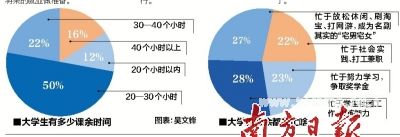 统计数据显示,约有23%的受访学生忙于努力学习,争取奖学金;有28%的受访大学生忙于学生社团工作,锻炼能力;还有27%的受访学生忙于放松休闲、刷淘宝、打网游,成为名副其实的“宅男宅女”;忙于社会实践、打工兼职的大学生则比例最少,占22%左右。