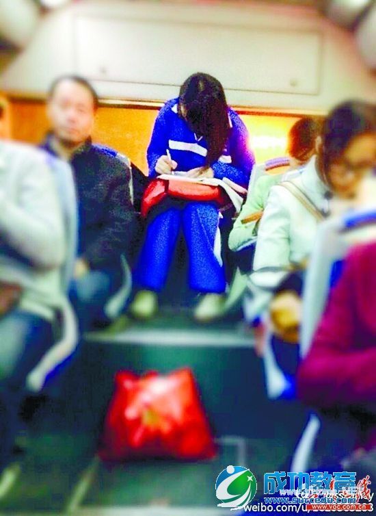 原标题:“校服美女”公交车上做作业 网友感叹学霸现身/图