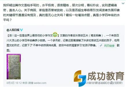 有网友在微博上质疑“最悲伤的小学作文”是枪手写的