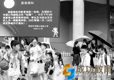 原标题:浙江瑞安停课应对超强台风 9月28日,浙江省瑞安市马鞍山实验小学学生在家长护送下离校。当日,由于超强台风“杜鹃”逼近,浙江省瑞安市教育局发出通知,在28日16时前,全市各学校、幼儿园、托幼机构、培训机构停止一切教育教学活动,学生及与抗台无关的人员一律撤离学校,并在29日停课一天,确保师生安全。庄颖昶 摄(新华
