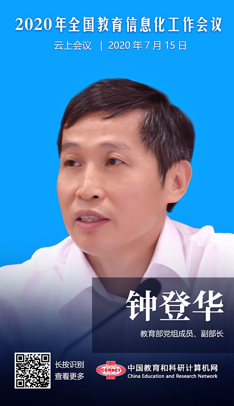 7月15日,2020年全国教育信息化工作视频会议在京召开,会议交流总结新冠肺炎疫情期间“停课不停学”工作经验,加快推进教育信息化2.0发展。会议在教育部设主会场,各省级教育行政部门设分会场。教育部党组成员、副部长钟登华出席会议并讲话。教育部科技司司长雷朝滋主持。