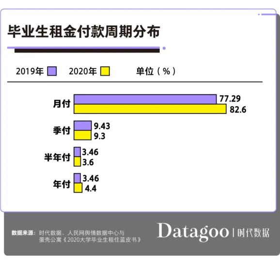 此外,房租对于刚毕业的大学生来说是每月最大的一笔开支,占个人工资比重的一半甚至更多。因此,从租金付款周期来看,支付周期越短的越受毕业生欢迎。今年,选择月付的毕业生已经上升至82.6%,较去年上升约5.3%。