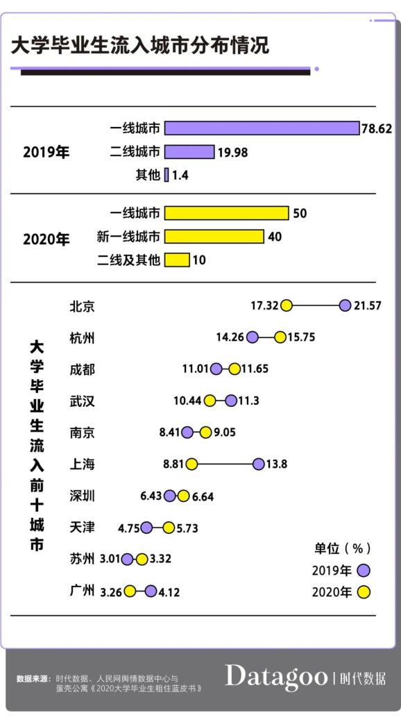 一直以来,一线城市北上广深都是大学毕业生的首选之地。但是,随着新一线城市的发展以及落户、住房补贴、创业基金等“人才新政”,因此新一线城市的吸引力也在不断上升。据8月12日,人民网舆情数据中心联合蛋壳公寓等共同发布的《2020大学毕业生租住数据蓝皮书》(以下简称“《蓝皮书》”)显示,大学毕业生选择去一线城市的占比从去年的78.62%下降至今年的50%,而去往新一线城市的毕业生也从去年的不足19.98%大幅增长至今年的40%。