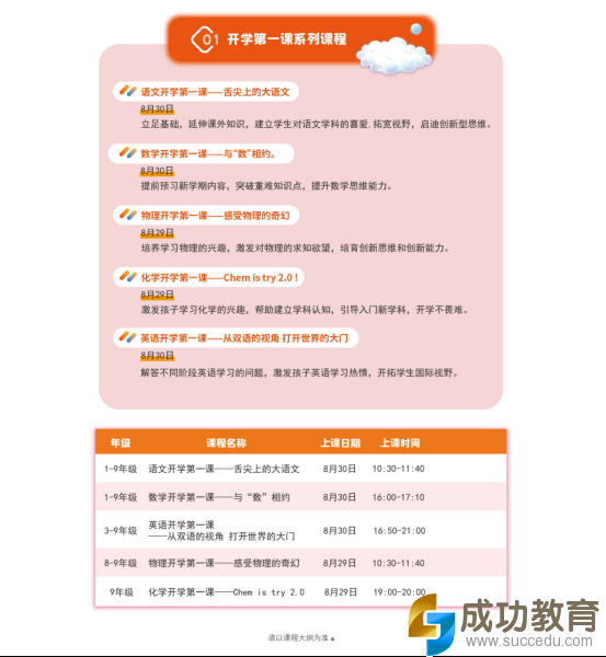 语数外物化五大学科齐助力,暑假收心逆袭新学期。分别是语文开学开学第一课-舌尖上的大语文、数学开学第一课-与“数”相约、物理开学第一课-感受物理的奇幻、化学开学第一课—Chem is try 2.0!、英语开学第一课—从双语的视角,打开世界的大门。帮助孩子迎战新学期,做好新学期规划。