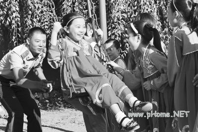 朝鲜族小学生在警营训练场上荡秋千。国庆期间,吉林省公安边防总队集安边防检查站启动“留守儿童警营七天乐”活动。当地留守儿童来到警营体验部队生活和训练,学习国防知识,玩小游戏,度过了一个有意义的国庆节。(管清江 摄)