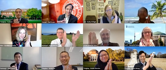 清华大学副校长、教务长杨斌,校务委员会副主任袁驷与来自美国康奈尔大学、法国交叉科学研究院、美国edX平台、蒙古科技大学、新加坡南洋理工大学、北京大学、意大利米兰理工大学、美国莱斯大学、德国亚琛工业大学、俄罗斯圣彼得堡国立大学、上海交通大学、泰国Thai MOOC平台、新西兰奥克兰大学、智利大学、英国曼彻斯特大学、肯尼亚内罗毕大学、加拿大多伦多大学、学堂在线、浙江大学的联盟创始成员代表相聚“云端”,共谋交流合作新发展,为即将于12月11日世界慕课大会上正式发布的世界慕课联盟奠定良好基础。