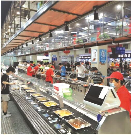 天津职业大学历时4年,搭建原料采购管理系统,建设中央厨房,引进应用自助售饭、打菜、订餐等智能系统,于2018年建成了食堂原材料精细化管控、食材集约化生产、饭菜自助化售卖、大数据运营分析的新型高校“智慧食堂”。