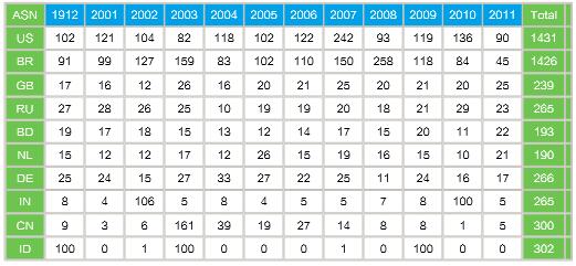图3 近12个月ASN号码新增数最多的国家/地区(单位:个)