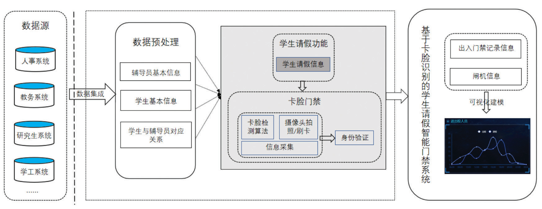 本文提出的基于卡脸识别的学生请假智能门禁系统整体框架设计如图1所示。首先对校内各业务系统数据源,例如人事系统、教务系统、研究生系统、学工系统等的相关数据进行集成与预处理,获取需要的辅导员基本信息、学生基本信息、学生与辅导员对应关系;其次,通过学生基本信息、辅导员基本信息、学生与辅导员对应关系完成学生请假功能的开发,获取学生请假信息;最后将学生请假数据与卡脸门禁进行对接,结合卡脸检测算法,实现请假学生的智能化身份验证和门禁开放。同时,门禁系统自动记录人员出入信息,便于后续可查,可追溯。采用可视化建模技术,结合出入门禁记录信息和闸机信息,可实现学生出入校园的统计分析,为学校疫情防控大数据分析提供有效的数据支撑。