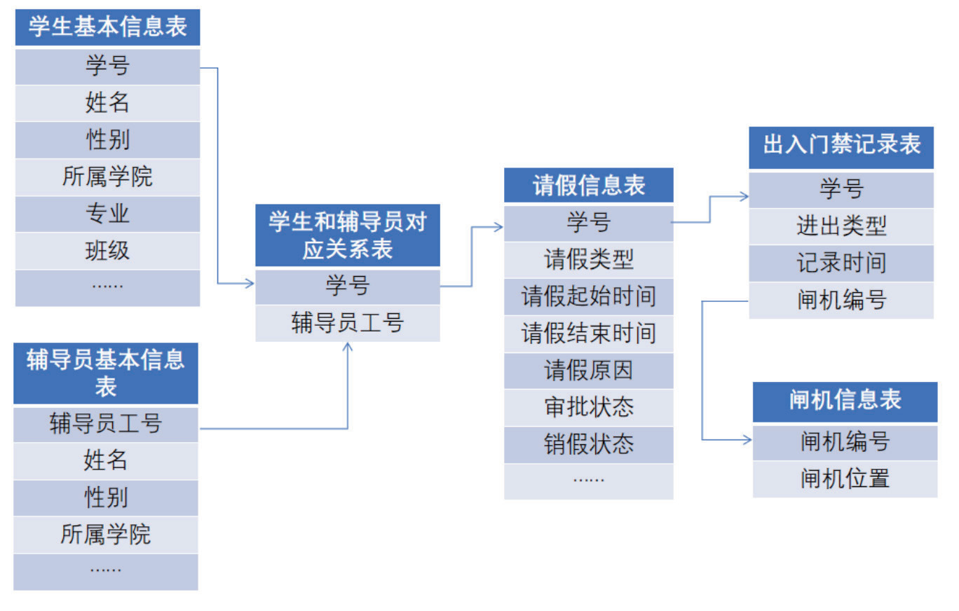 学生请假智能门禁系统在进行自动身份验证、门禁开放和人员出入记录分析时,需要将相关数据表进行关联,从而获取到需要的数据资源。首先,将学生基本信息、辅导员基本信息、学生与辅导员对应关系进行关联,实现学生请假申请到对应辅导员审批的功能;其次,根据审批结果,审批通过的请假信息同步至卡脸门禁系统,实现门禁的自动开放与身份验证;最后,根据出入门禁记录和闸机信息,实现出入人员的信息记录(谁因为什么事情在什么时间从哪个闸机位置出入校园的记录)。其中,各表之间的关联关系如图2所示。