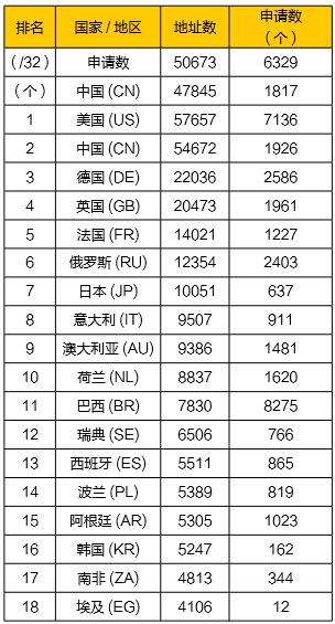 截至2020年12月底,全球IPv6地址申请(/32以上)总计40665个,分配地址总数为318126*/32。表3为地址数总计获得4096*/32 (即/20) 以上的国家/地区。