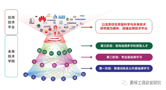 注:第一阶段重点强调数理基础及”文史哲艺经美“等宽厚的人文素养训练,第二阶段重点学习本专业基础性课程知识,第三阶段以未来技术需求为导向,定向选拔培养具有多学科背景的本科人才。依托北京仿生界面科学与未来技术研究院为载体,搭建应用技术平台,通过应用技术平台与产业界对接,实行产教协同育人,实现用现有的高新技术领军人才去培养未来高新技术领军人才。