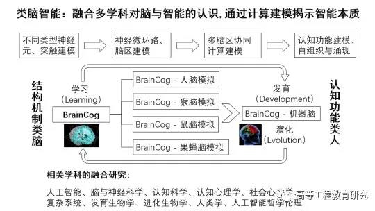 由涉及核心关键问题的教研室来统筹规划相关交叉领域的学生培养模式以及配套的课程体系,制定教学大纲和教学计划,组织优秀教师团队集体备课和完成教学任务,确定对学生的考核内容。在专业课程中,由来自不同学科的教师组成授课团队,从多学科交叉的视角解读研究问题,让学生体会到多学科研究的魅力,理解多学科思维方式。以该学院开设的《类脑智能导论》课程为例(图2),便是在融合人工智能、脑与神经科学、认知心理学、发育与演化生物学等近十个学科相关知识的基础上,从不同类型的神经元、突触建模、认知功能建模、自组织涌现与演化,并在机器人、无人机等平台实现智能应用,通过多学科对脑与智能的认识计算建模,揭示智能本质,展望智能的未来。再如开设的《仿生智能纳米材料》课程,对仿生智能纳米材料进行了精细化分层,从分子结构到纳米结构再到微观结构、宏观结构的层层递进,最终达成8个以上产业的功能型运用,实现了认识自然、模仿自然、超越自然的跨越性研究。