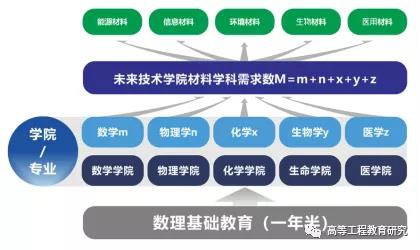 下面以材料学科为例(图4)说明学院对学生选拔的办法。传统材料学只关注材料学领域本身人才培养,而未来技术学院从能源材料、信息材料、生物材料和环境材料等各前沿技术领域出发,在完成通识教育的前提下,从数学、物理、化学、生物和医学等学院成比例选拔对未来材料技术有研究志趣的优秀本科生,进入学院进行交叉学科的培养。