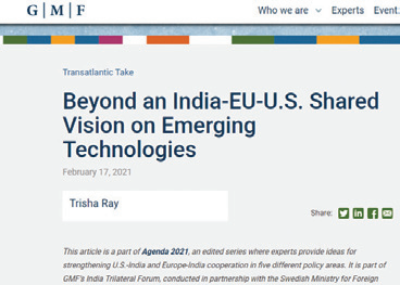美国的公共政策研究和募款组织德国马歇尔基金会(GMF)2月17日发布《美欧印对新兴技术的共同愿景》报告,旨在探索美国、欧盟和印度开展新兴技术合作的方式。报告指出,印度作为全球主要电子产品制造国、高潜力数字市场和多个技术联盟参与者,是美欧重要的新兴技术战略合作伙伴。目前,印度推出的“数字印度”计划旨在将自身转变为全球数字中心;而美欧通过“印度一美国科学技术论坛”、《欧盟一印度科技合作协定》,已与其建立合作关系。报告也指出,印度与美欧的技术合作仍存在缺少技术流动和安全信任等障碍。