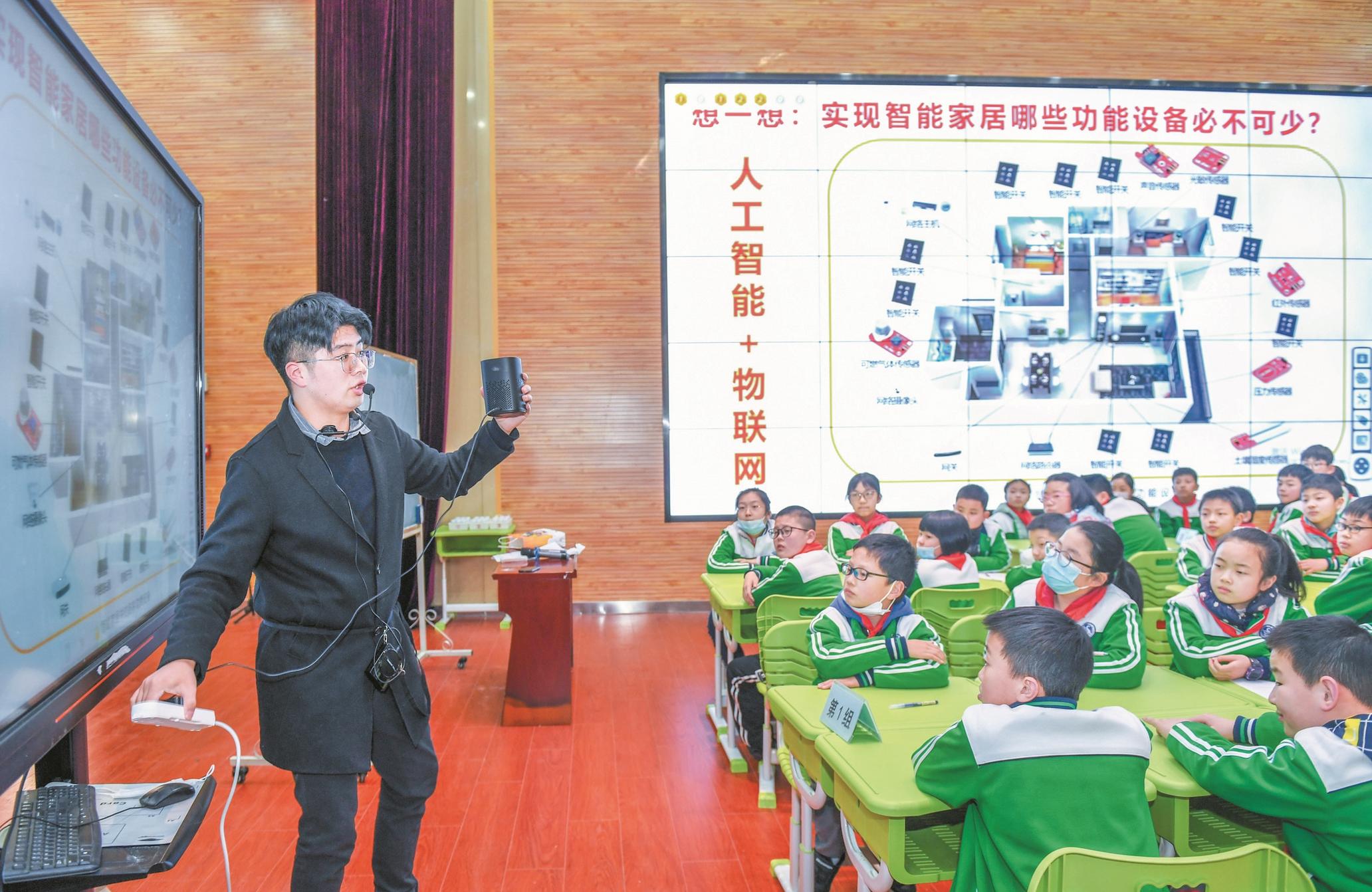 3月22日下午,在武汉市光谷实验小学505班的人工智能公开课《智能家居》上,孩子们先复习AI(人工智能)和LOT(物联网)的概念,进入互动环节后,他们对着智能音箱发号施令,玩起了老师做的有人脸识别功能的智能门模型,还跟随着视频畅想未来的智能家居生活……学生戴星翊说,这是他上的第5节人工智能课,内容很新。