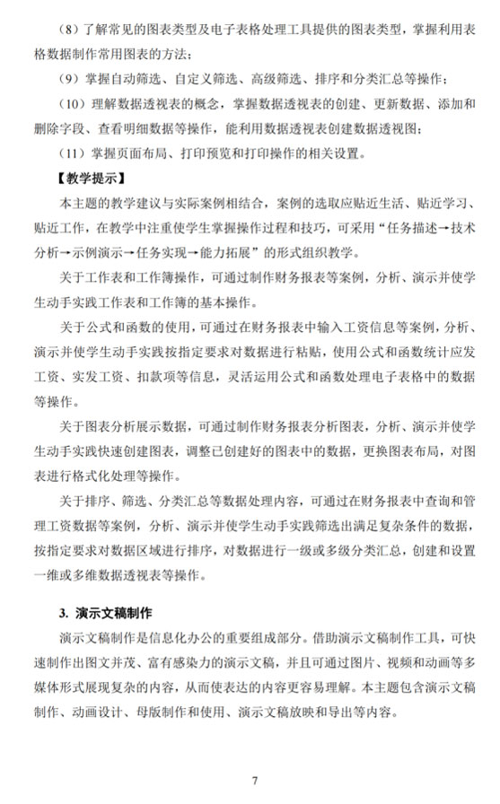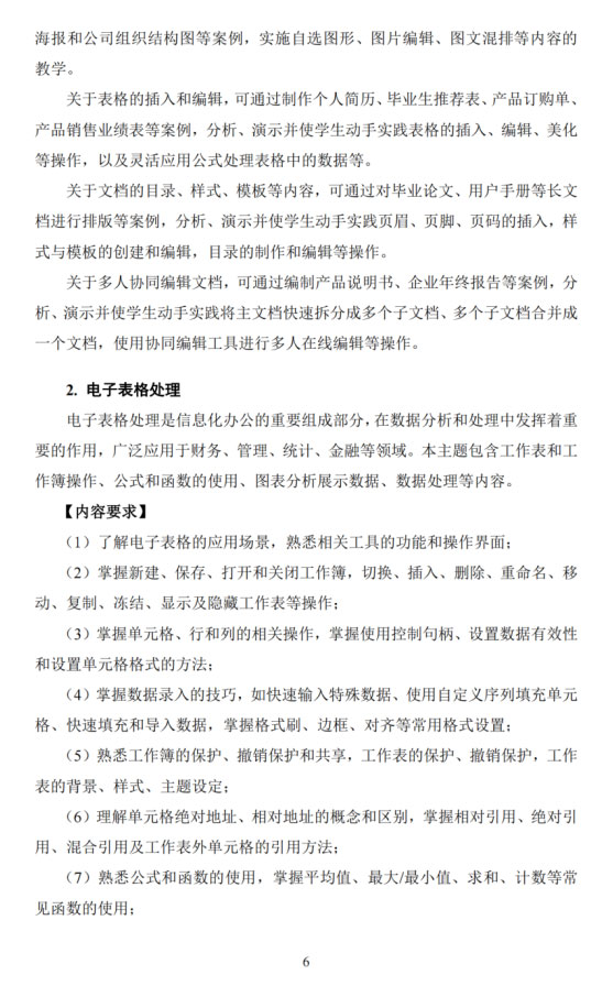 《高等职业教育专科信息技术课程标准(2021年版)》明确,高等职业教育专科信息技术课程是各专业学生必修或限定选修的公共基础课程。其学科核心素养主要包括信息意识、计算思维、数字化创新与发展、信息社会责任四个方面。目标是通过理论知识学习、技能训练和综合应用实践,使高等职业教育专科学生的信息素养和信息技术应用能力得到全面提升。