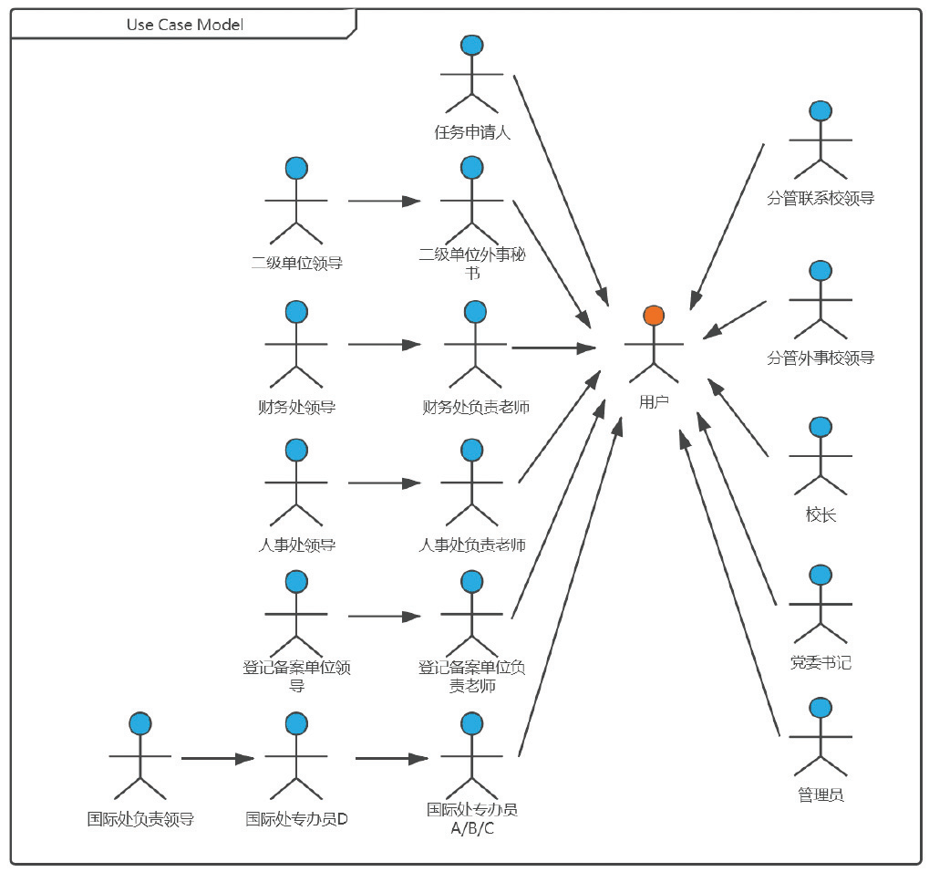 通过梳理线下业务办理流程,分析系统使用人员应包括:任务申请人、二级单位外事秘书、二级单位领导、财务处负责人、财务处领导、人事处负责人、人事处负责领导、登记备案单位负责人、登记备案单位负责领导、国际处出入境科专办员、国际处出入境科科长、国际处负责领导、分管联系校领导、分管外事校领导、校长、党委书记,详情如下图: