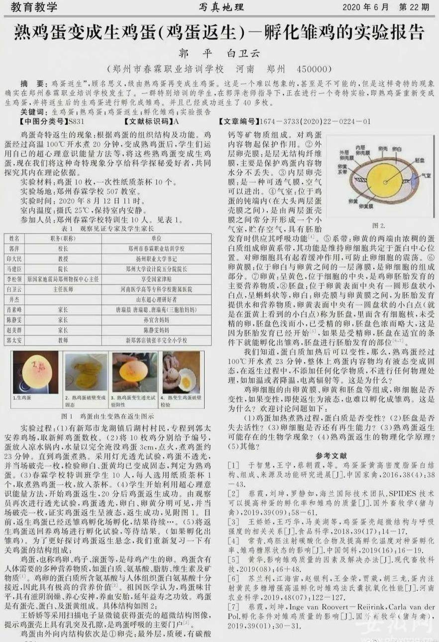 近日,一篇有关“熟蛋返生孵雏鸡论文”在网上疯传。据悉,论文全名《熟鸡蛋变成生鸡蛋(鸡蛋返生)——孵化雏鸡的实验报告》,收录在《写真地理》期刊,作者单位为郑州春霖职业培训学校。据公开报道信息显示,该校老师郭某还有物体穿瓶越壁、熟绿豆返生发芽等相关著作。