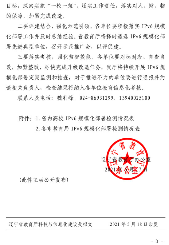 近日辽宁省教育厅办公室发布《关于进一步推进互联网第六版(IPv6)规模部署工作的通知》(辽教办〔2021〕153 号 ),督促辽宁省教育系统尽快完成IPv6规模化部署工作目标,加速开展IPv6下一代互联网与教育教学融合创新。通知全文如下: