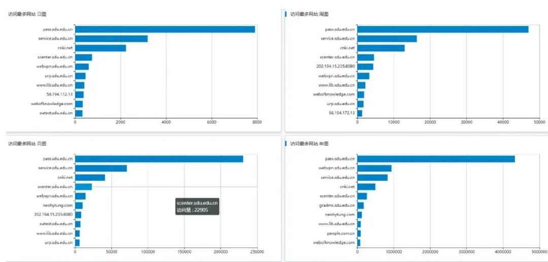 图6是2020年WebVPN的日访问、周访问、月访问和年访问的数据统计。从数据中可以看出,不同时间段内访问排名前十的网站,其中有五个网址都与图书馆有关,分别是CNKI知网、瀚堂近代报刊数据库、人民日报、SCI四个资源网址和图书馆网站。