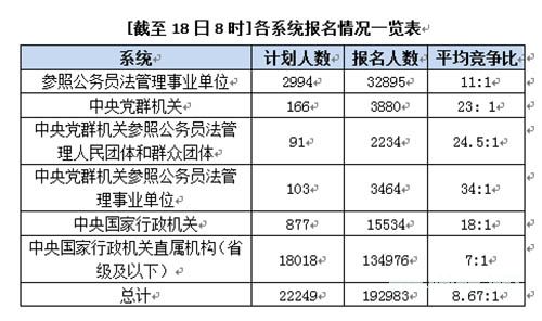人民网北京10月18日电 (记者 魏艳)记者从教育机构获悉,截至18日上午8点,报名审核人数已达192983人,与去年和前年同期均超过22万的数据相比,少了3万余人。平均竞争比为8.67:1,不及