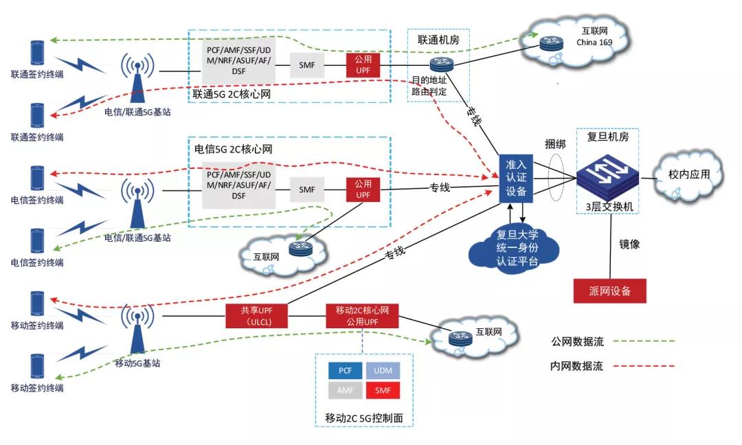 传统的校园网络存在着明确的地域边界,师生用户在校外无法直连访问校园网,唯有通过VPN拨号接入学校内网。随着学校办学格局的优化拓展、对外交流合作的不断增加,尤其在2020年新冠疫情爆发后,越来越多师生用户需要从校外访问校内资源、开展联合科研项目,校园网络边界正逐渐成为阻碍资源共享、协同创新的重要因素。为建成高速泛在、集成互联、安全可控的新型校园网络,并全面推进IPv6规模化部署,复旦大学自2020年起,陆续启动了与中国联通、中国移动、中国电信三大运营商的5G虚拟校园网联合建设项目,目前已经在上海地区初步建成