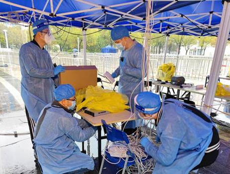 △分公司员工冒雨为核酸检测现场进行网络保障