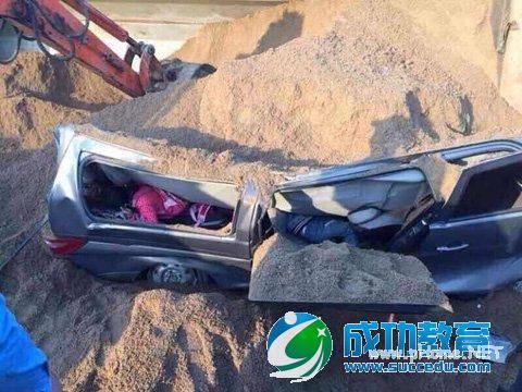昨日下午,事发地附近的一位村民介绍,他在现场看见,一辆装满黄沙的大货车侧翻后,倾压在一辆灰色面包车上。面包车只露出一个车头和半边窗户,几乎整个车身都被黄沙埋住,面包车顶被压扁,车门都被压脱落了。