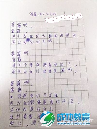 原标题:小学生作文《雾霾,我们分手吧》走红网络(图)