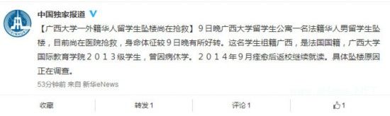 中新网1月10日电 据新华社对外部“中国独家报道”官方微博消息,9日晚广西大学留学生公寓一名法籍华人男留学生坠楼,目前尚在医院抢救,身命体征较9日晚有所好转。