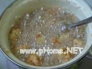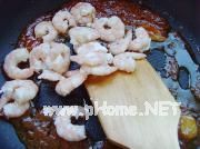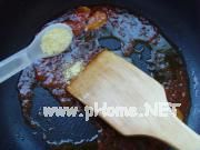 8、放入一汤匙番茄酱,一茶匙糖,炒匀。放半碗煮菠萝的糖水,一茶匙盐,调成合口的酸甜汁,至汤汁粘稠。