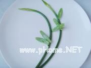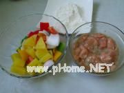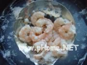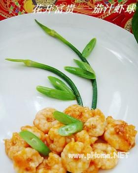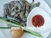 1、材料:鲜虾、蛋清造型:蒜薹、豆角调味:盐、鸡精、料酒、胡椒粉、糖、番茄沙司。