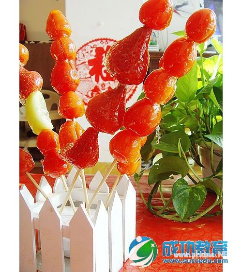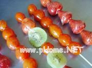 10、将裹好糖浆的水果串放在抹过水的平面上,冷却后即可取食。