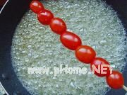 9、糖浆熬好后,迅速将水果串放入锅内裹上糖浆。