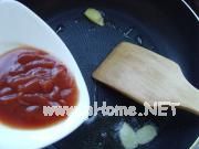 7、锅置火上油烧热,下姜片煸出香味后,放入番茄沙司,炒出红油。