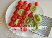 3、将处理好的草莓、番茄、猕猴桃用竹签串起。