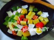 7、锅里放三分之一汤匙食用油,炒一下彩椒和洋葱片,炒均匀。