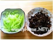 6、放木耳以莴笋丝,用筷子沾汤汁适当调入盐,炒香。
